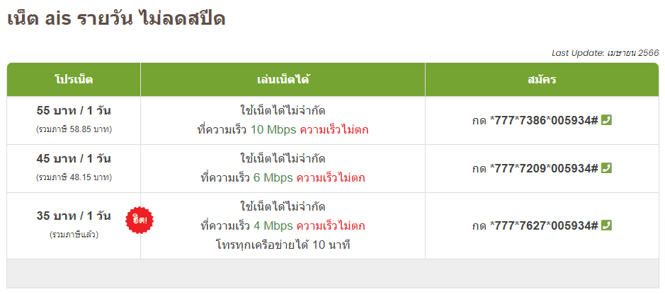 AIS มีหลายแพ็กเกจโปรเน็ตรายวันที่ ดังนั้นเราแนะนำให้คุณพิจารณาตามตารางข้างล่างนี้เพื่อเลือกแพ็กเกจที่เหมาะสมกับความต้องการของคุณ: