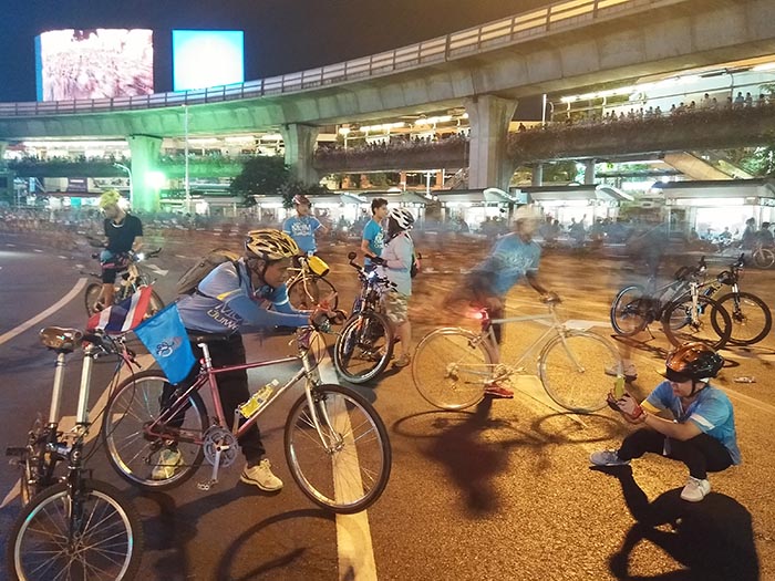 บรรยากาศอีกมุมหนึ่งของจุดรวมพลบนถนนราชดำเนินนอก เต็มไปด้วยมวลมหาชนคนรักการปั่นจำนวนมหาศาล เป็นภาพประวัติศาสตร์ที่หาดูได้ยาก และไม่แน่ใจว่าในชีวิตนี้จะได้เห็นภาพแบบนี้อีกหรือไม่